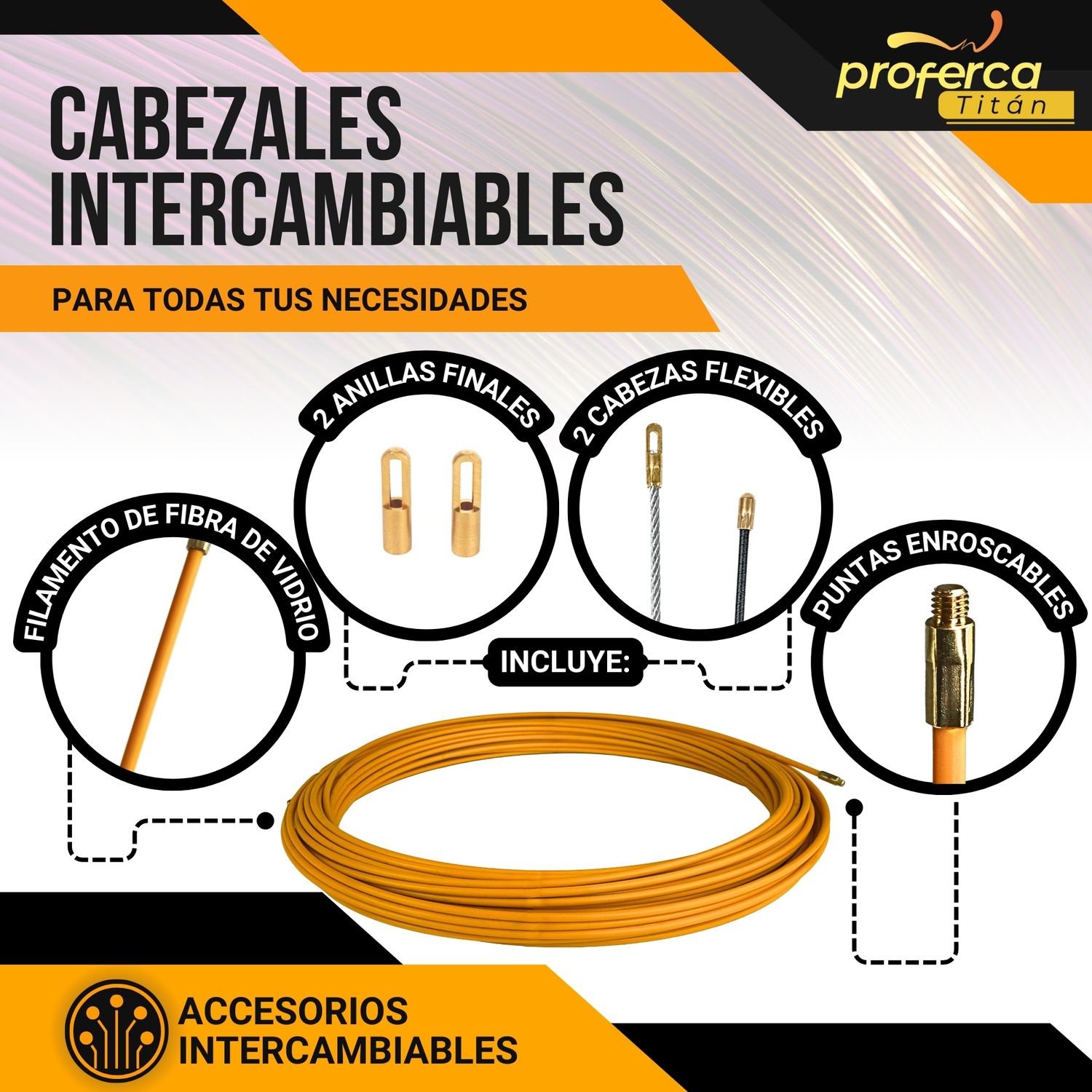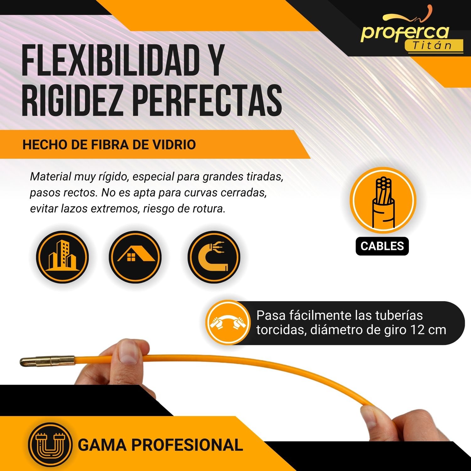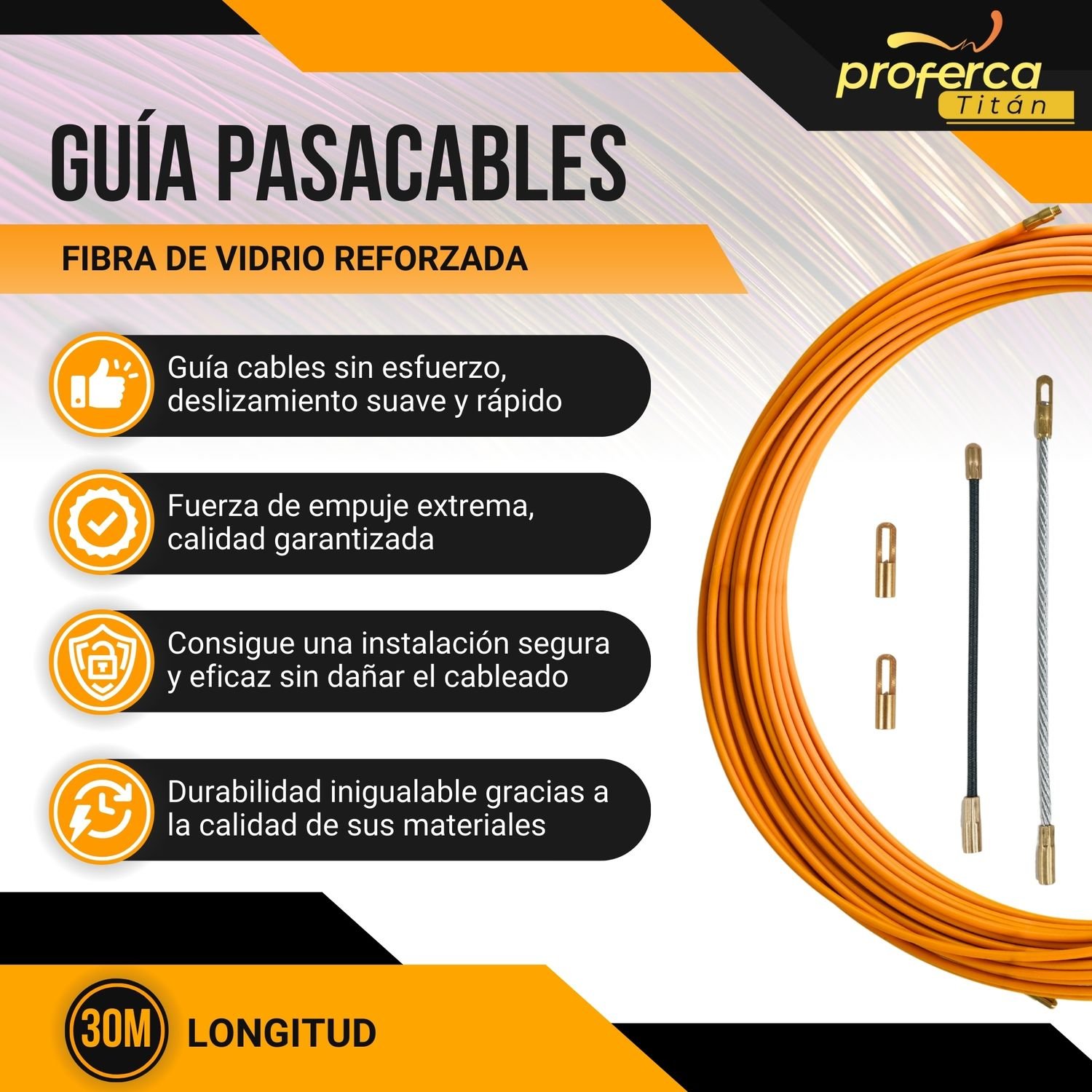 La Guía Pasacables Profesional Proferca Titán de 4.5mm y 30 metros es una herramienta esencial para electricistas y profesionales del cableado. Fabricada en fibra de vidrio reforzada.