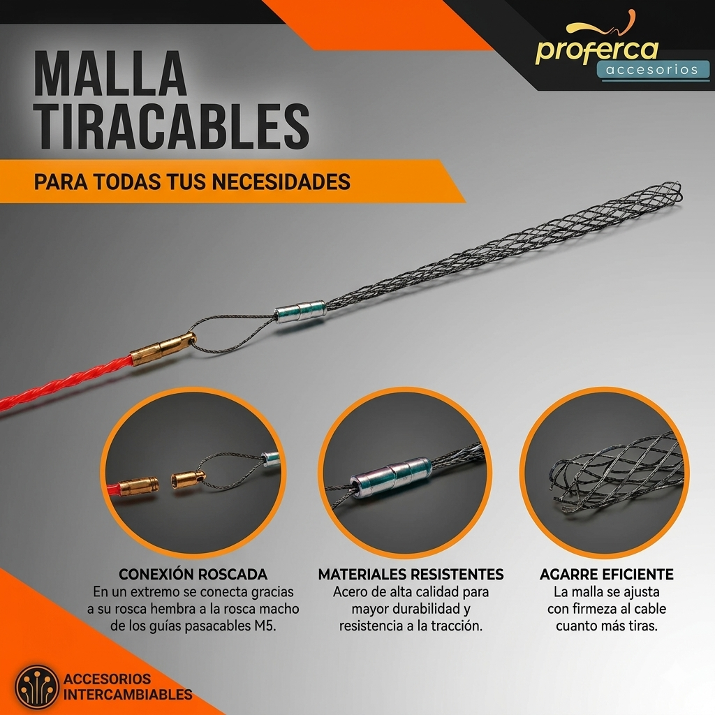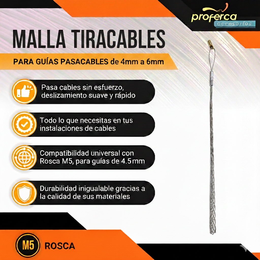 Está fabricada en acero para ofrecer una durabilidad muy alta y un rendimiento constante en uso intensivo. Incorpora rosca M5 con enganche de latón, logrando una conexión firme y estable con tu guía pasacables profesional. Es apta para guías pasacables desde 4mm hasta 6 mm y está pensada para trabajar como pasacables eléctrico en tubos, canalizaciones y conductos, ayudándote a ahorrar tiempo y reducir intentos.
